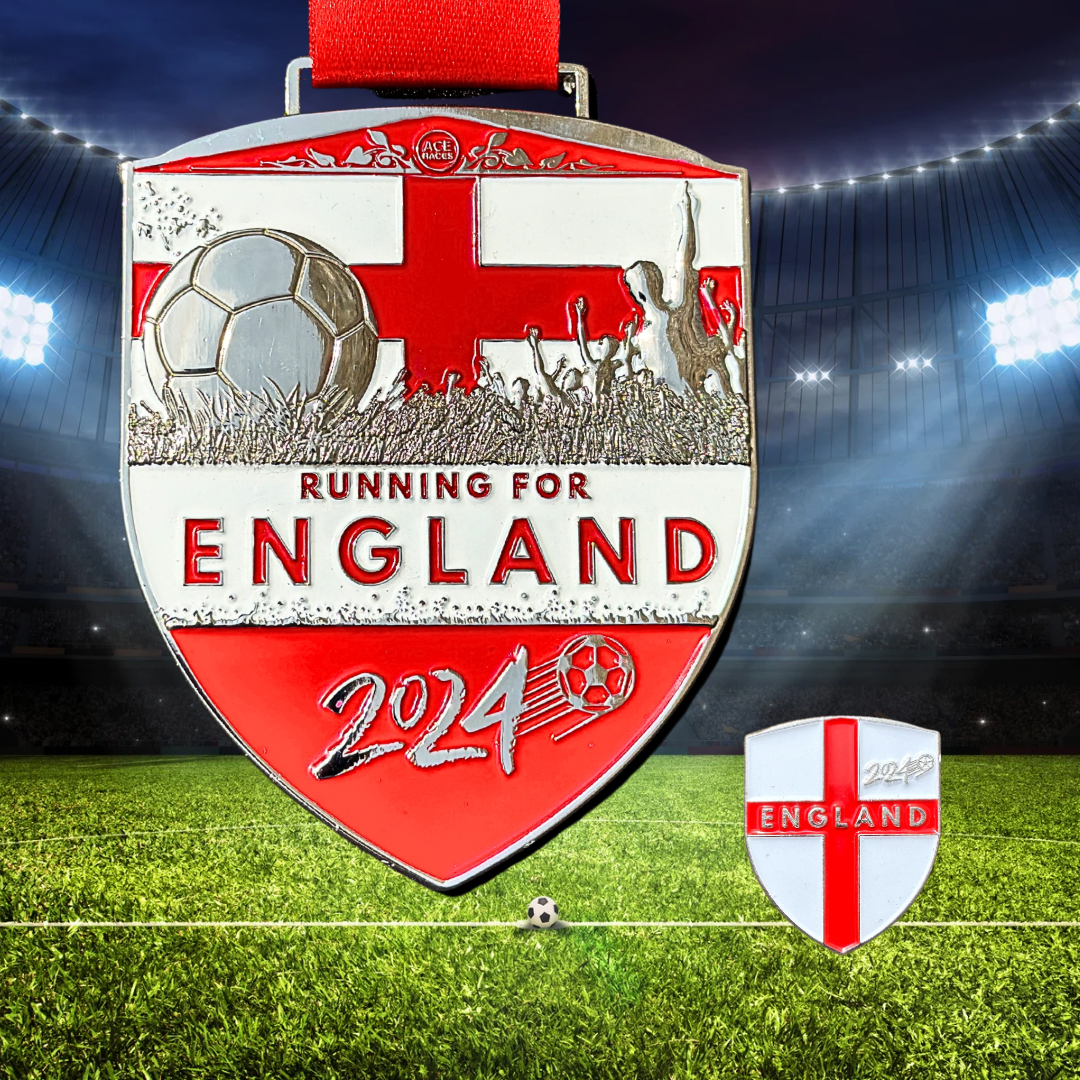 Support and celebrate the England football team in 2024 with The Running for England Virtual Race. This is a special event where a pin badge will also be included. This medal is large in size and 3D and is a must for any collection.